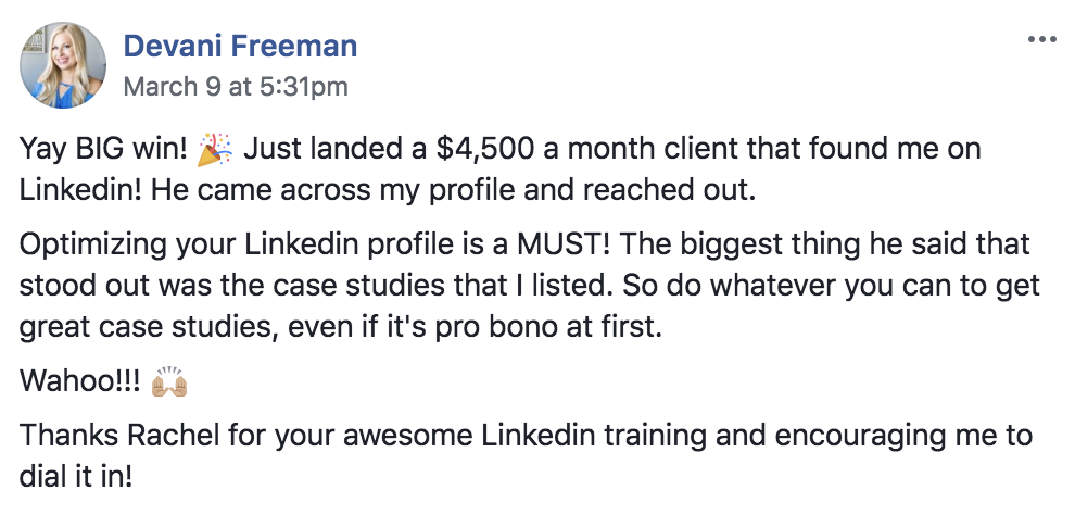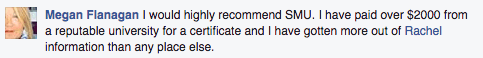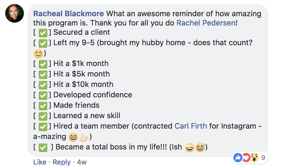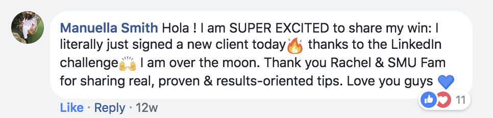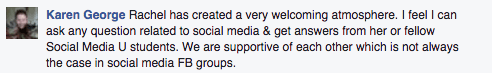 "Of all of the courses I have taken for managing social media, Rachel's has by far been the most beneficial. Her charming and uplifting personality is motivating and her directions are simple to follow, understand and execute. The value Rachel provides to her quickly-growing community is truly unique and I'm so glad to have the opportunity to learn from her!"