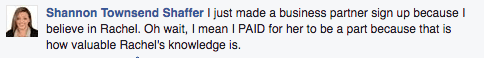 "Rachel is an excellent speaker and instructor. Her knowledge and ability to share what she knows in an easy and fun flow makes learning and implementing what she has taught a breeze! She is totally transparent in her interaction and delivery. It is a hard skill to master--making things look so easy. Her positive and vibrant personality top it off."